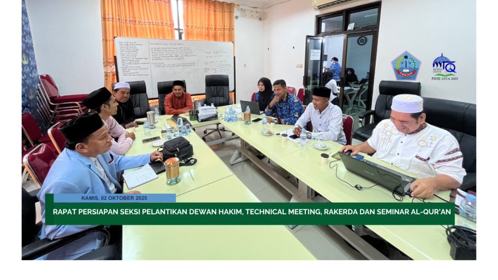 Pidie Jaya, 02 Oktober 2025 — Dalam rangka menyukseskan rangkaian kegiatan Musabaqah Tilawatil Qur’an (MTQ) tingkat Aceh, panitia pelaksana menggelar rapat persiapan seksi pelantikan dewan hakim, technical meeting, Rapat Kerja Daerah (RAKERDA), serta Seminar Al-Qur’an, yang berlangsung pada Kamis, 02 Oktober bertempat di Ruang Rapat Sekret MTQ.