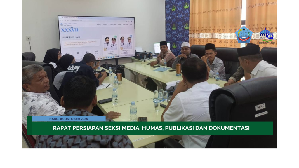 Pidie Jaya, 08 Oktober 2025 – Dalam rangka menyukseskan pelaksanaan Musabaqah Tilawatil Qur’an (MTQ) ke-37 tingkat Aceh tahun 2025, Seksi Media, Humas, Publikasi, dan Dokumentasi menggelar rapat koordinasi pada Rabu, 08 Oktober 2025, bertempat di Ruang Rapat Sekretariat MTQ.