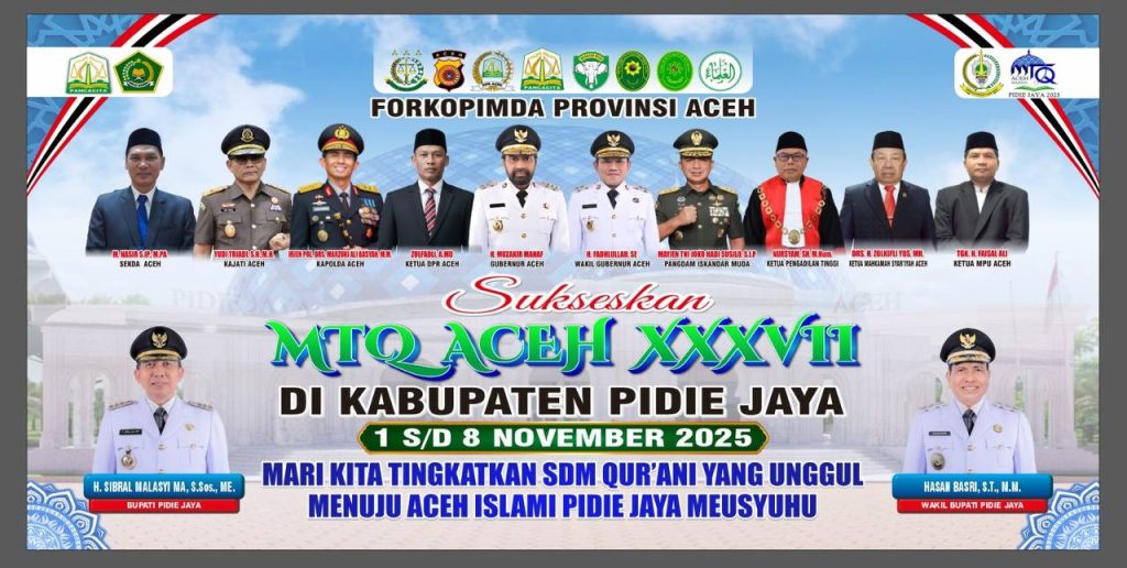 Pidie Jaya — Forum Koordinasi Pimpinan Daerah (Forkopimda) Provinsi Aceh bersama Pemerintah Kabupaten Pidie Jaya berkomitmen penuh menyukseskan pelaksanaan Musabaqah Tilawatil Qur’an (MTQ) Aceh ke-XXXVII, yang berlangsung mulai 1 hingga 8 November 2025 di Kabupaten Pidie Jaya.