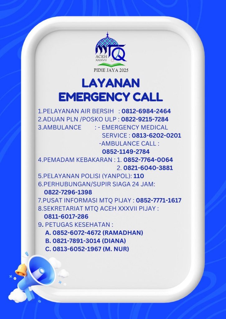 Pidie Jaya, 31 Oktober 2025 – Dalam rangka mendukung kelancaran pelaksanaan Musabaqah Tilawatil Quran (MTQ) ke-37 tingkat Provinsi Aceh yang berlangsung di Kabupaten Pidie Jaya, pemerintah daerah setempat bersama sejumlah instansi terkait menyiapkan layanan Emergency Call. Layanan ini bertujuan memberikan respon cepat terhadap berbagai kebutuhan dan situasi darurat selama event berlangsung.