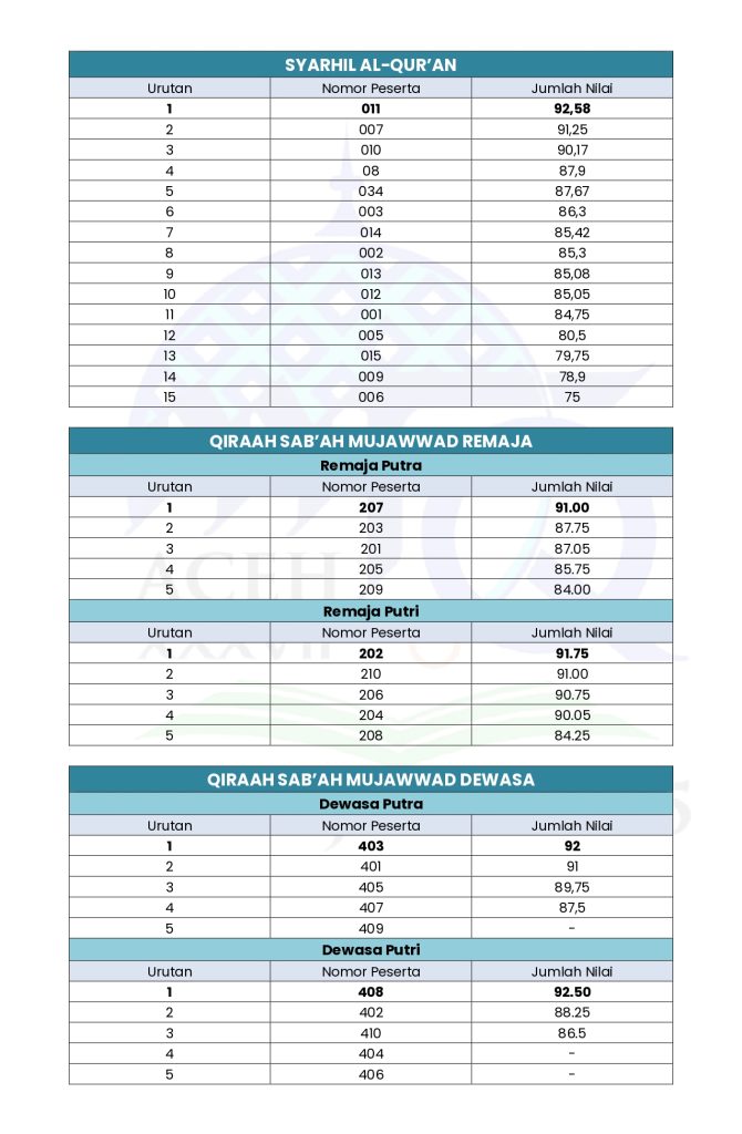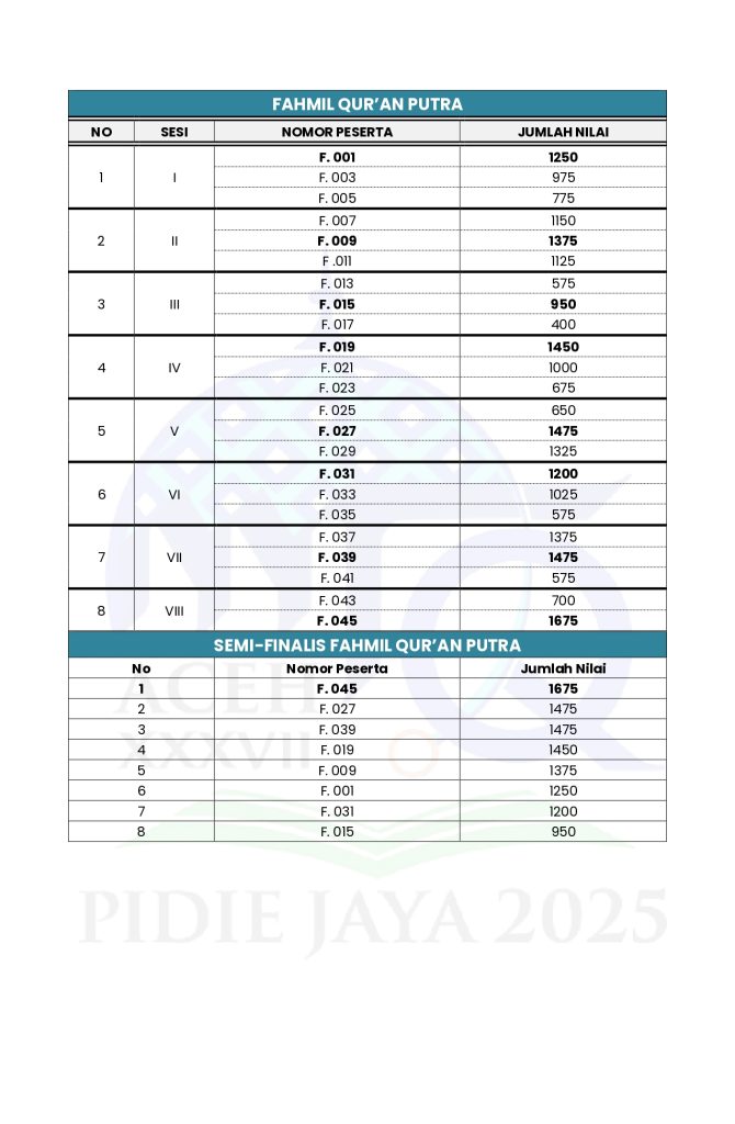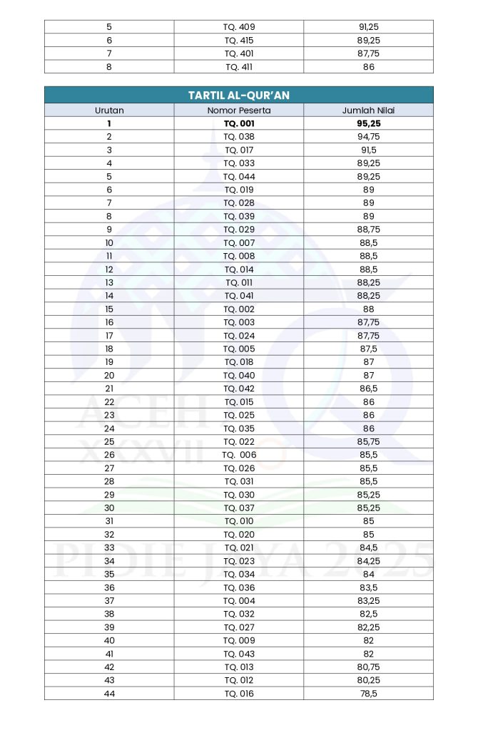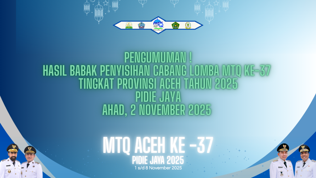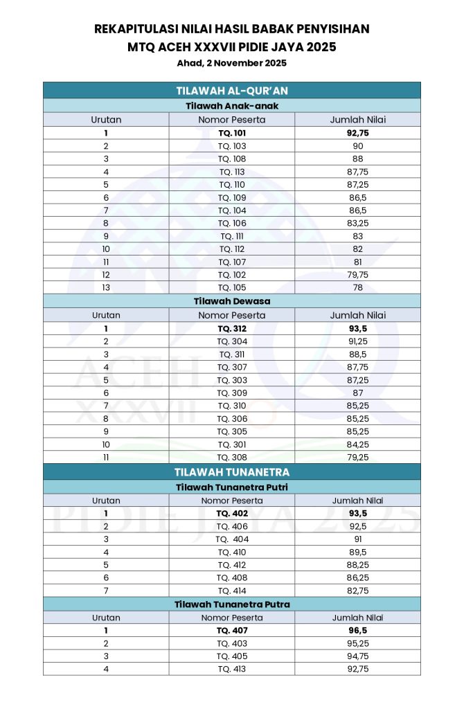 PENGUMUMAN! Rekapitulasi Nilai Hasil Penampilan Peserta Babak Penyisihan Musabaqah Tilawatil Qur’an (MTQ) ke-37 Tingkat Provinsi Aceh Tahun 2025 Pidie Jaya (1-2 November 2025)