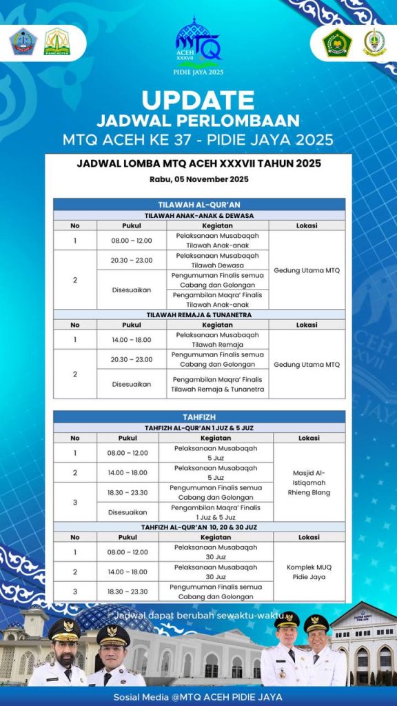 JADWAL LOMBA MTQ ACEH XXXVII 05 NOVEMBER TAHUN 2025