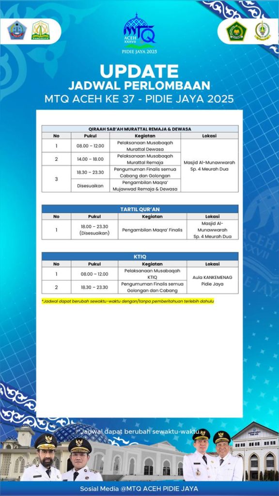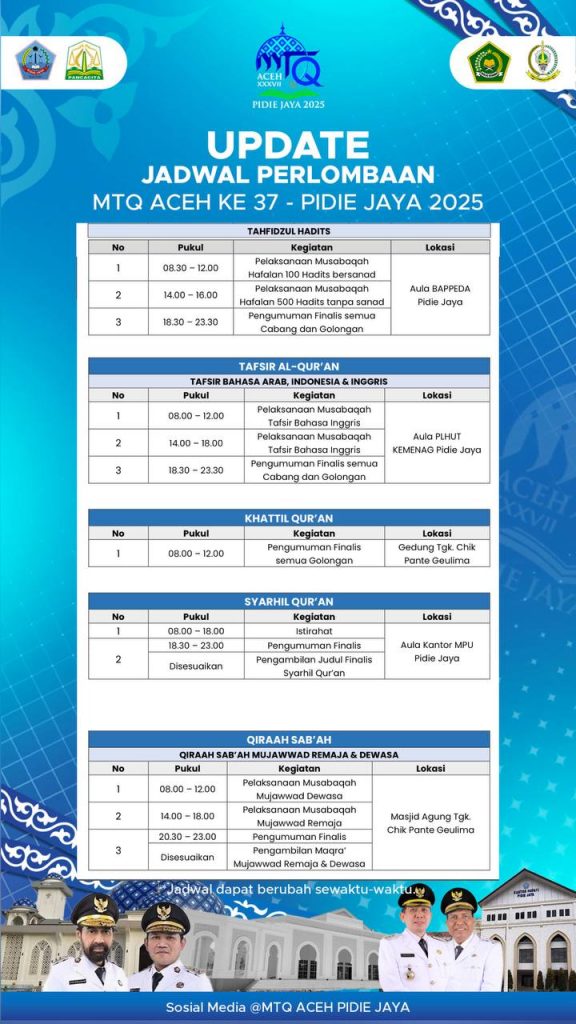 Berikut jadwal lomba MTQ Aceh XXXVII TAHUN 2025