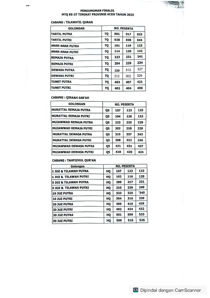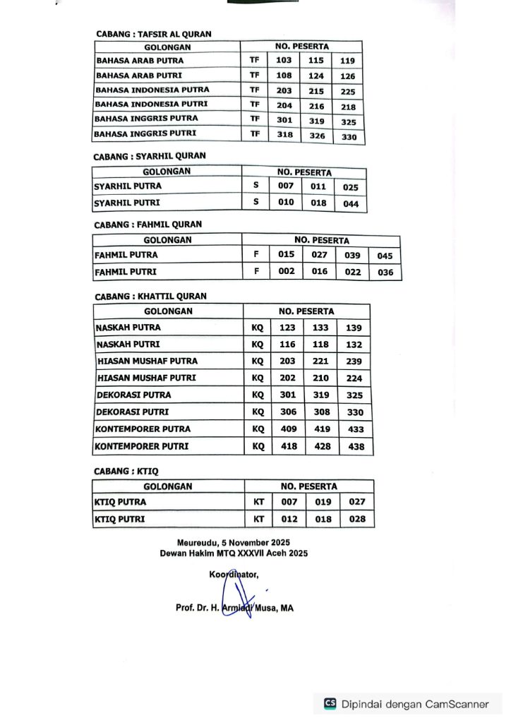 PENGUMUMAN! Rekapitulasi Nilai Peserta Finalis MTQ (Rabu, 05 November 2025)