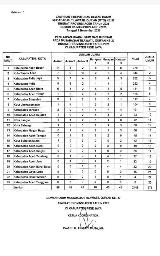 Berikut klasemen akhir MTQ ke-37 Tingkat Provinsi Aceh Tahun 2025: