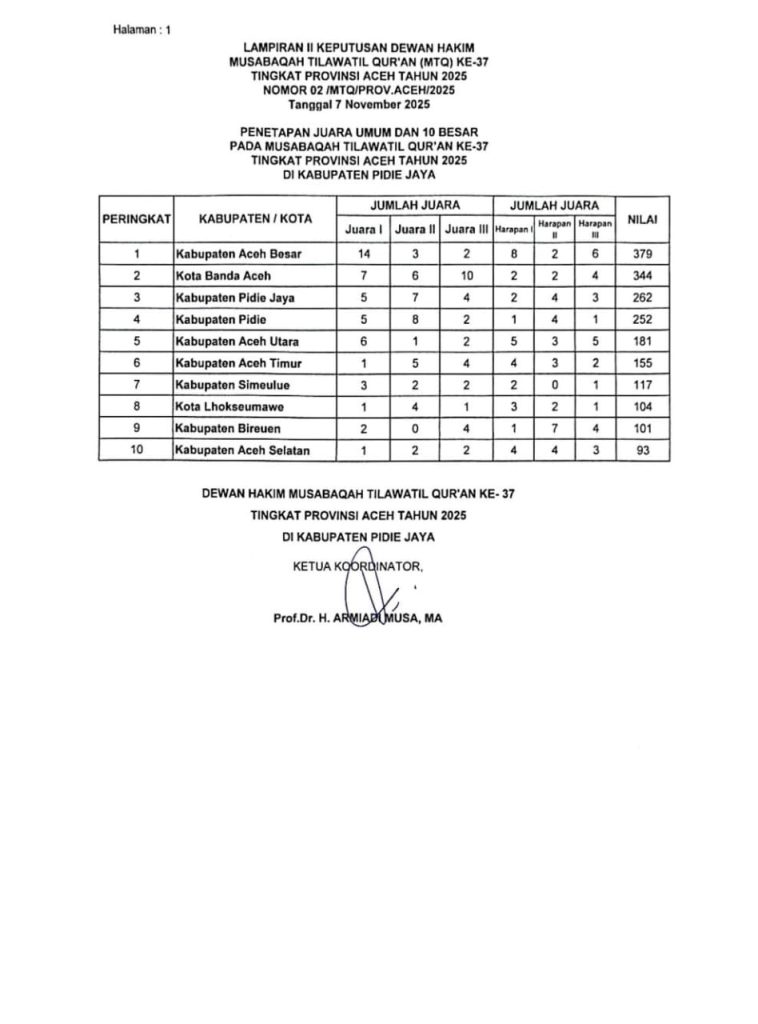 PENGUMUMAN! Hasil Akhir dan Daftar Juara Musabaqah Tilawatil Qur’an (MTQ) ke-37 Tingkat Provinsi Aceh Tahun 2025 Pidie Jaya