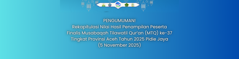 Dengan penuh rasa syukur, Panitia Pelaksana Musabaqah Tilawatil Qur’an (MTQ) ke-37 Tingkat Provinsi Aceh Tahun 2025 di Kabupaten Pidie Jaya mengucapkan selamat dan tahniah kepada kafilah-kafilah terbaik yang telah meraih prestasi gemilang pada ajang ini.
